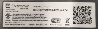 The Extreme Networks WS-AP3935i (internal antennas) and WS-AP3935e (same but with external/detachable antennas) is a dual-band 4×4 MIMO 802.11ac (5GHz) and 802.11b/g/n (2.4GHz) “enterprise grade” access point with two Gigabit Ethernet ports. It can be powered via 802.3af PoE (ETH1, ETH0) or a standard 12V 1.1A power adapter and was produced by Extreme Networks.